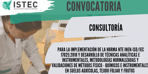 TRABAJA CON NOSOTROS: CONSULTORIA PARA LA IMPLEMENTACIÓN DE LA NORMA NTE INEN-ISO/IEC 17025:2018 Y DESARROLLO DE TÉCNICAS ANALÍTICAS E INSTRUMENTALES, METODOLOGÍAS NORMALIZADAS Y VALIDACIONES DE MÉTODOS FÍSICO – QUÍMICOS E INSTRUMENTALES EN SUELOS AGRÍCOLAS, TEJIDO FOLIAR Y FRUTOS 📝🔗 Revisa las bases de la convocatoria en el siguiente link: https://istecec-my.sharepoint.com/:b:/g/personal/investigacionvinculacion_istec_edu_ec1/ESl5zNQvT1NJpsMNWT8swssBtonTDWuKr2SKdU2k7So2aA?e=qhro4w