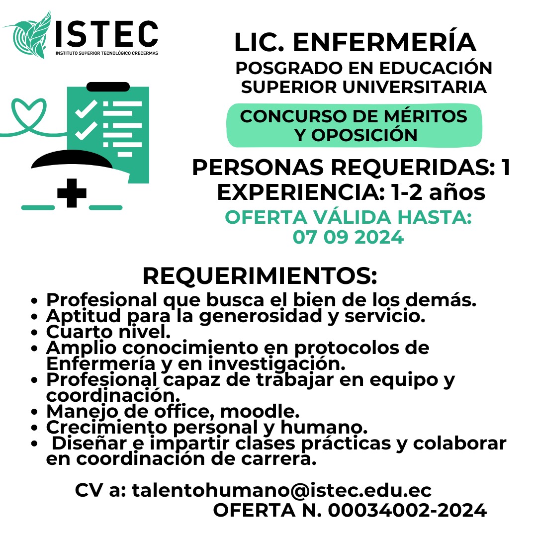 En ISTEC estamos en búsqueda de Licenciado(a) en Enfermería que cuente con posgrado en Educación superior Universitario👩‍⚕️👨‍⚕️