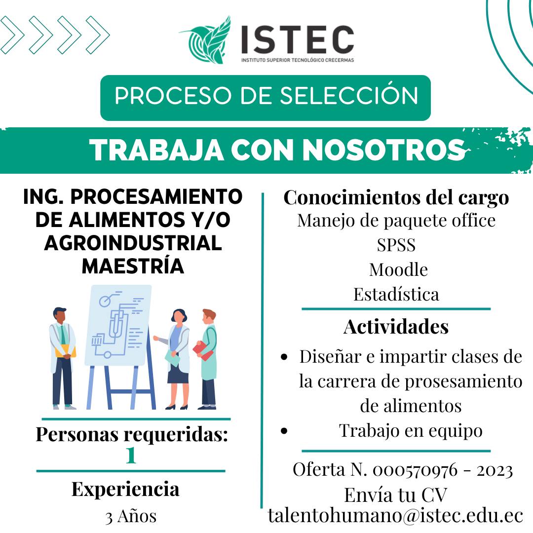 En ISTEC estamos en búsqueda de Ingeniero(a) de Procesamiento de Alimentos y/o Agroindustrial con Maestría